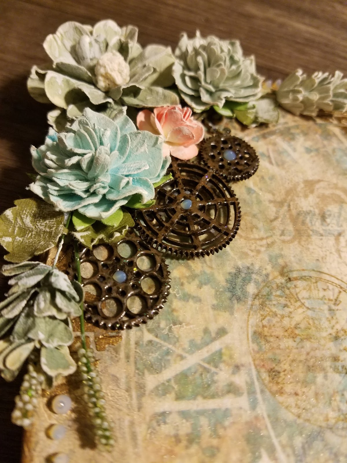 Next I start laying out my embellishments, I used gears and 49 & Market Flowers along with sisal and more embossing on the chipboard. I took finnabair Rust paste and watered it down and added it on and around everything to give that "old" look.